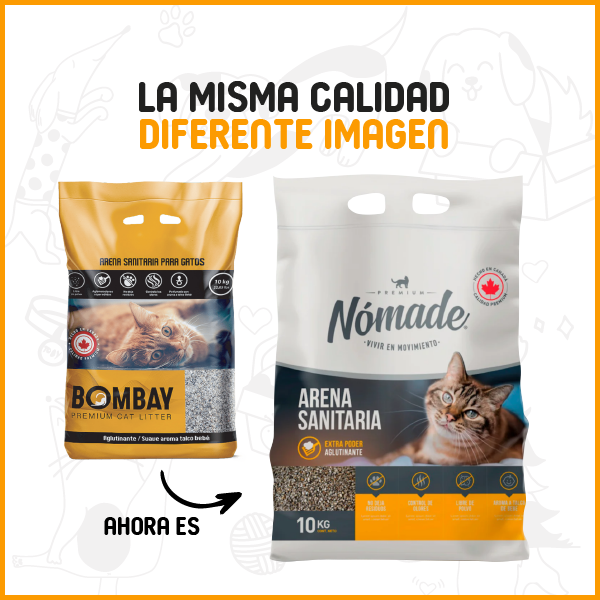 Ahora la arena sanitaria Bombay ¡Es nómade! La misma calidad de siempre, ahora en bajo una nueva marca. Arena sanitaria elaborada con bentonita de calidad Premium, desempolvada para cuidar el bienestar de su mascota y su familia.